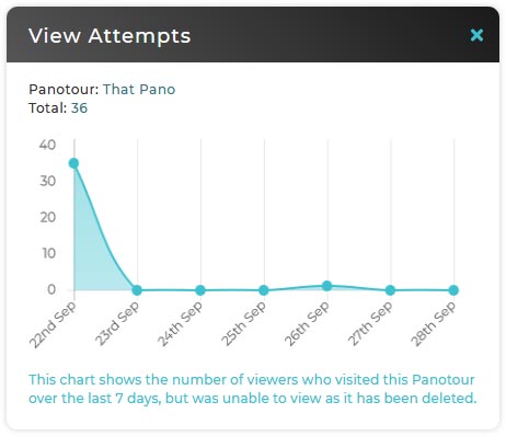 You are able to see the number of times a user on the web attempts to view the Panotour, but could not because it was deleted. Clicking on the number opens up the chart detailing the number of attempts over the past week.