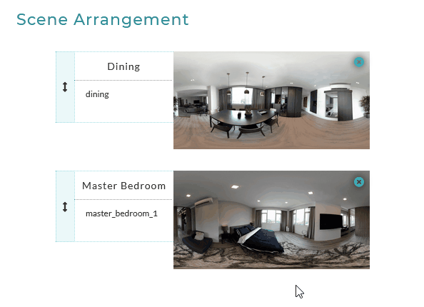 To delete a scene, in the scene ordering area, click on the X icon on the top right hand corner. You will be prompted to prevent accidental deletion.