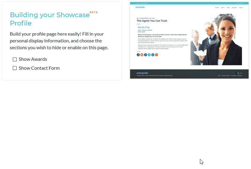 To build your profile, log in and navigate to Showcase Profile, or https://www.sandbox.panopedia.com/account/showcase/profile.