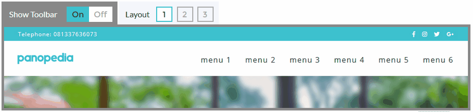 The top toolbar is a quick eye-catcher, showing your contact information as well as your social media links. You may choose to show or hide it by the Show Toolbar switch.